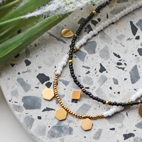 Con i nuovi ciondoli in acciaio inox puoi creare accessori davvero fantastici. Questa volta abbiamo pensato di combinarli in una collana di perline rocaille. Per realizzarla, infila le perline rocaille su un filo metallico, ad esempio scegliendo vivaci tinte estive. Tra le rocaille puoi infilare diversi ciondoli in acciaio inox. Otterrai così una divertente collana dai dettagli minimal. Questo tipo di collane è perfetto da mixare, indossandone diverse contemporaneamente. Aggiungendo alla chiusura un'allungatrice, puoi anche variare la lunghezza della tua collana.