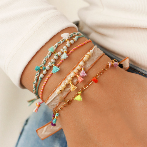 Poiché le mini nappine sono molto piccole, per creare dei bracciali è opportuno usare anche del materiale infilaperle. Scegli, ad esempio, la coda di topo o una catena a rolò sottile. Crea bracciali doppi con la coda di topo in 2 colori e combina le nappine con perline in metallo DQ e perline rocailles. Le nappine sono perfette anche con orecchini a cerchio a cui puoi fissarle con un anellino apribile.