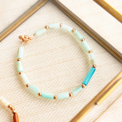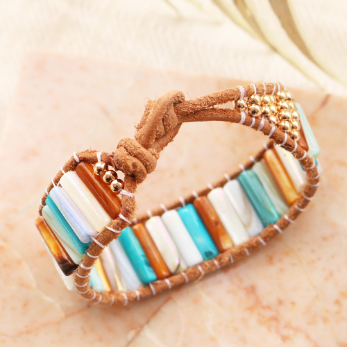 Le perline di conchiglia tubo avevano la nostra attenzione creando questi bijoux estivi. Queste bellissime perline sono disponibili nei vari colori, ognuna con una bellissima lucentezza perlacea. Ciò conferisce ai tuoi bijoux un ulteriore effetto radioso. È possibile utilizzare le perline di conchiglia quando si creano braccialetti alla moda. Infila le perline di conchiglia insieme con perline di metallo DQ su filo metallico e fissa una chiusura all'estremità. Dai un tocco in più al braccialetto attaccando una conchiglia ciprea o un bel ciondolo di metallo DQ nel mezzo. Anche la pelle DQ e le perline di conchiglia sono una combinazione meravigliosa. Prendi due strisce di pelle e collega le perline di conchiglia tubo tra loro, le perline puoi fissare con filo infilaperle. Chiudi questo braccialetto facendo un nodo e un cappio nella pelle. Buon divertimento!