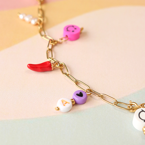 Hai voglia di realizzare gioielli super colorati e vivaci? Mettiti alla prova con la collezione di perline di polimero! Potrai creare queste collane di tendenza utilizzando la catena a rolò a maglie grosse, le perle d’acqua dolce di grandi dimensioni, le perline alfabeto in acrilico e ciondoli vari. Le perline di polimero sono coloratissime, ma le puoi comunque utilizzare per realizzare articoli davvero eleganti. Ad esempio, potresti creare un distanziatore con perle d’acqua dolce e una perlina di polimero. Per farlo puoi utilizzare un chiodino oppure puoi fissare un pezzo di filo metallico a entrambi i lati della catena a rolò. Dopodiché, crea una catena a rolò fissando vari ciondoli al gioiello. Che ne diresti di un bel ciondolo a forma di peperoncino? È facile trasformare le perline di polimero, come ad esempio gli smiley, in un ciondolo utilizzando un chiodino. Divertiti con questi simpatici articoli e libera la tua creatività!