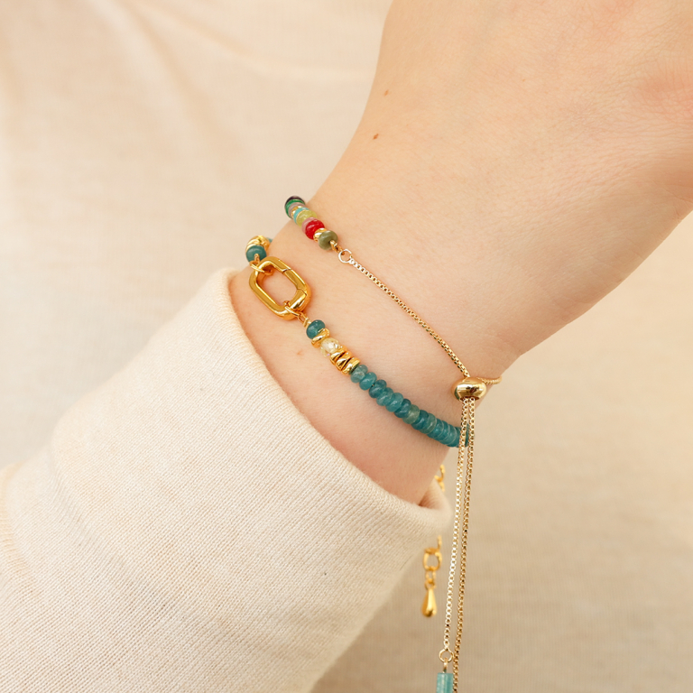 Queste perline in pietra naturale, dai bellissimi colori primaverili, possono essere abbinate alle perline in metallo DQ della collezione. Puoi creare bracciali alternando perline in pietra naturale con perle d'acqua dolce e con zirconia, ad esempio. Completa il bracciale con una chiusura e un’allungatrice. Se utilizzi perline cilindriche grandi, puoi infilare questa perlina con foro grande su una perlina più piccola, in modo che la perlina cilindrica rimanga ferma.
