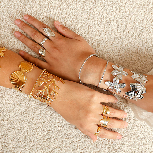 Questa nuova collezione di bracciali rigidi e anelli in acciaio inossidabile è un vero must-have! Con forme incantevoli come conchiglia, fiore e fiocco, aggiungi stile alla tua collezione con facilità. Mix & match per completare il tuo portagioie!
